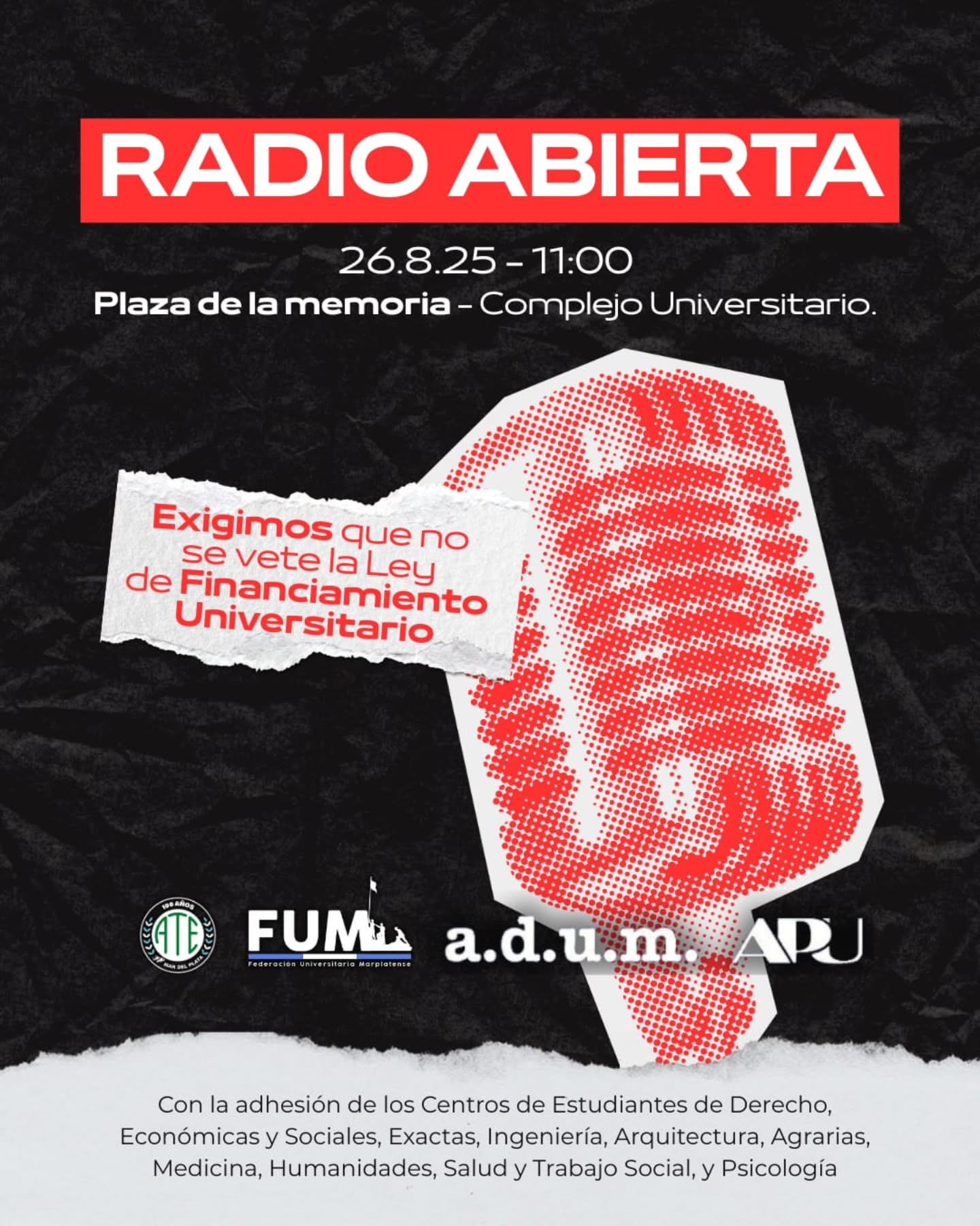 Como una iniciativa en conjunto entre los gremios que forman parte de la Universidad Nacional de Mar del Plata, junto a la Federación Universitaria Marplatense, se realizará este Martes 26 una Radio Abierta exigiendo «que no se vete la Ley de Financiamiento Universitario».