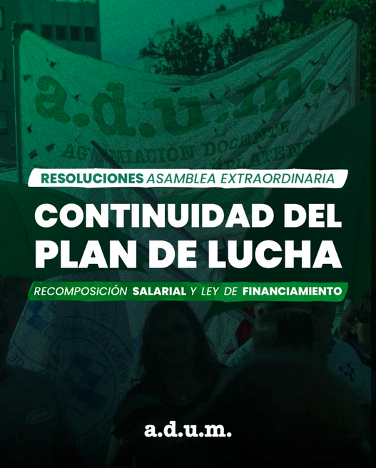 La Agremiación Docente Universitaria Marplatense (ADUM), tras una Asamblea Extraordinaria, presentó su Plan de Lucha 2026 con el objetivo de «profundizar el plan de acción en defensa de los salarios, de la Ley de Financiamiento y de la universidad pública».