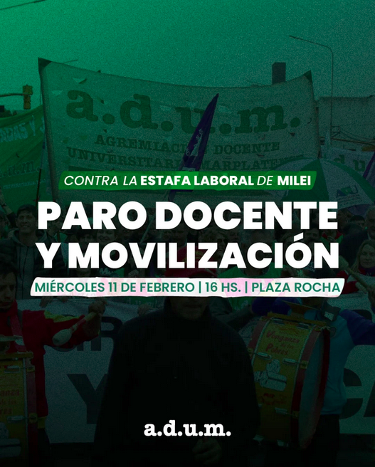 En ese marco, desde ADUM afirmaron: «Este Miércoles 11, los y las docentes universitarias estamos de paro todo el día y movilizaremos a la tarde por el centro de la ciudad, concentraando desde las 16 en Plaza Rocha, en Luro y 14 de Julio».