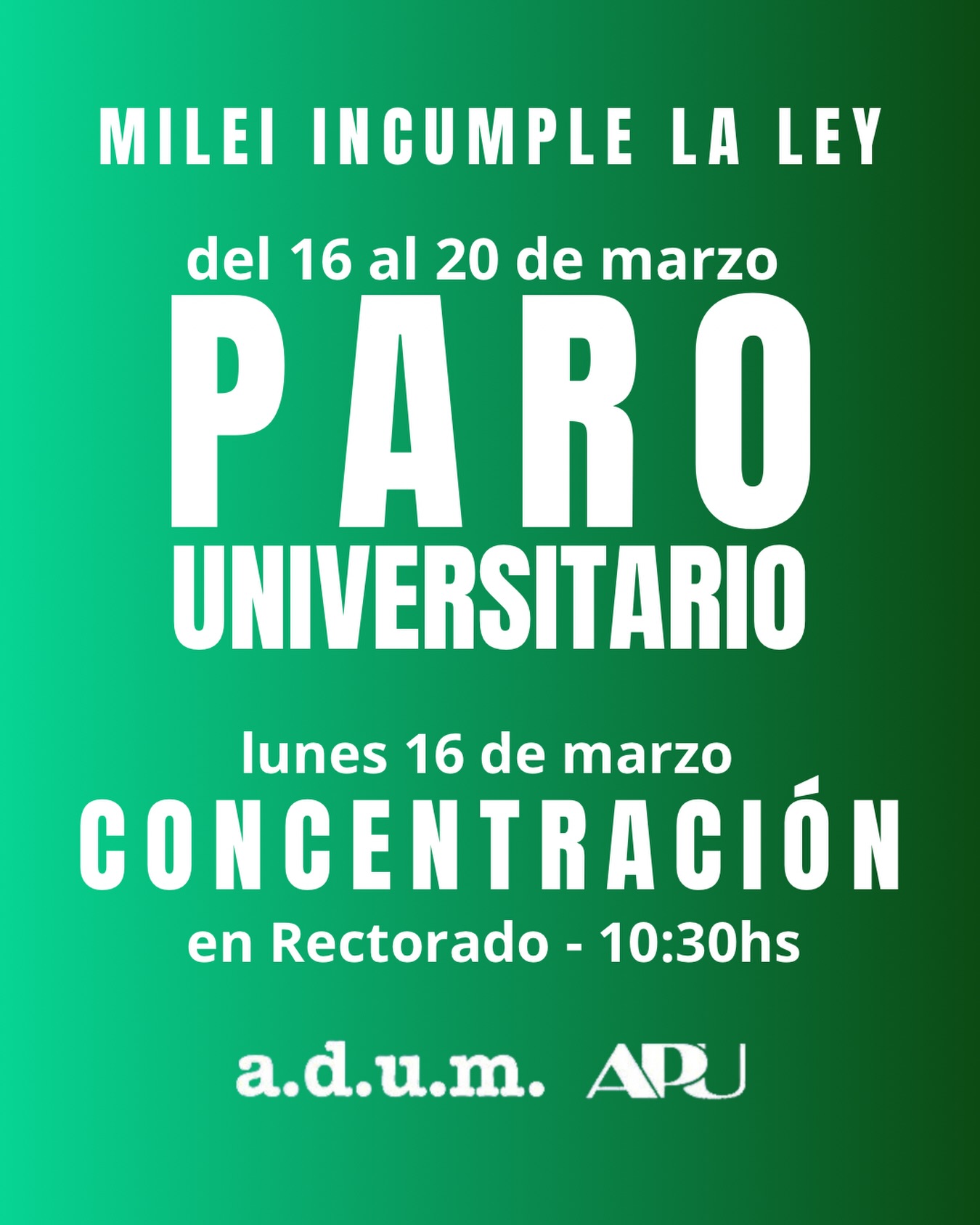 La Agremiación Docente Universitaria Marplatense (ADUM) junto a la Asociación del Personal Universitario (APU) dieron inicio a una medida de fuerza «que será de una semana de paro total de actividades del 16 al 20 de Marzo en reclamo del cumplimiento de la Ley de Financiamiento Universitario, la convocatoria urgente a paritarias y la asignación de los recursos necesarios para garantizar el funcionamiento pleno del sistema universitario», según explicaron desde las entidades gremiales.
