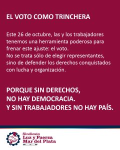 Bajo el título «Alerta trabajadores: la esclavitud avanza», el Sindicato Luz y Fuerza Mar del Plata emitió un comunicado en el que denuncia que «el Gobierno nacional ha relanzado su ofensiva contra el mundo del trabajo» ante el anuncio de una Reforma Laboral post-electoral. A continuación, la transcripción del mismo: