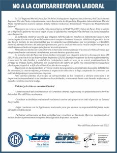 A través de un comunicado elaborado en conjunto entre la Asociación de Abogados y Abogadas Laboralistas de Mar del Plata, la CGT Regional Mar del Plata, la CTA de los Trabajadores Regional Mar y Sierras, y la CTA Autónoma Regional Mar del Plata, se expresó un «expreso, total y enfático rechazo al denominado ‘Proyecto de Modernización Laboral’».