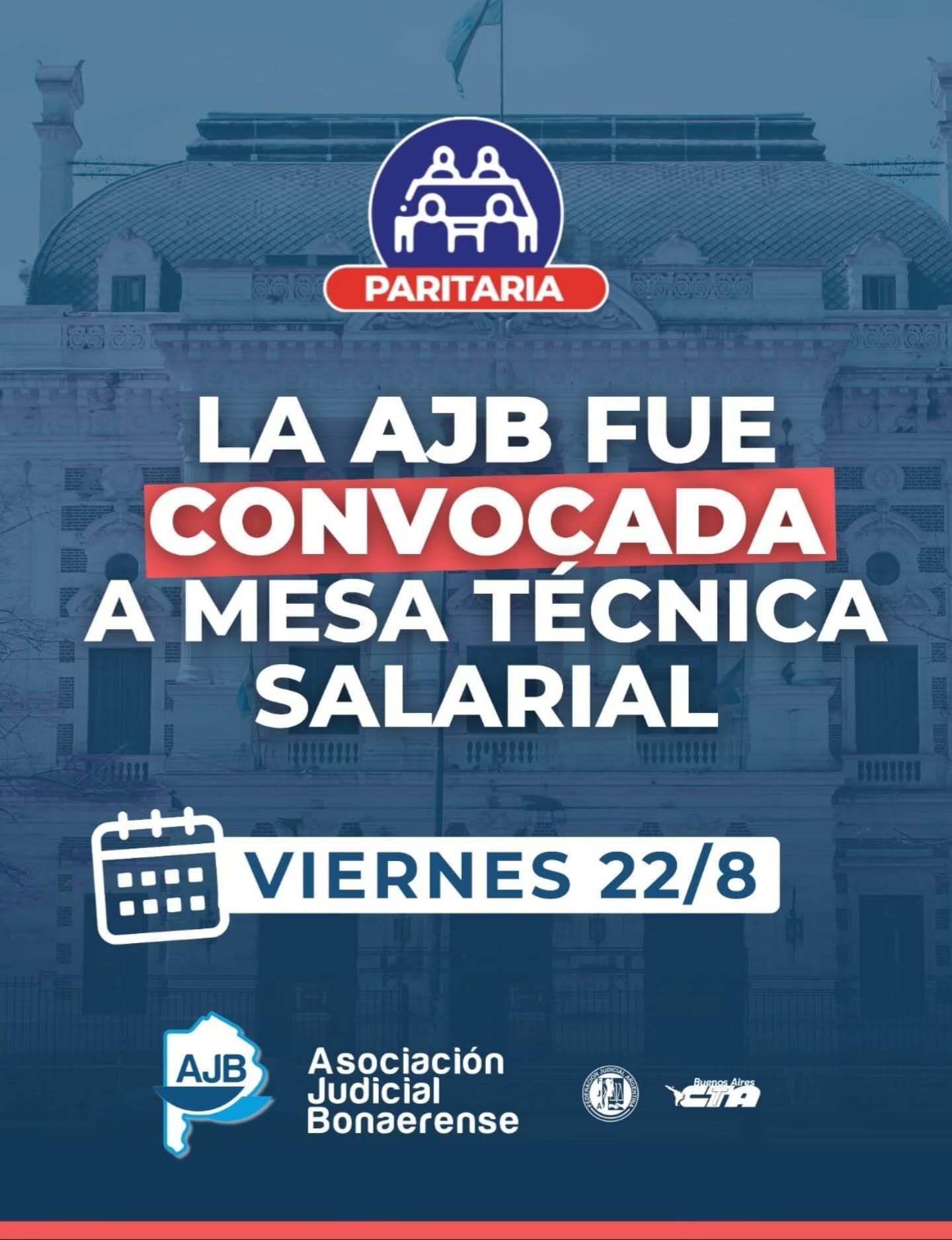 La Asociación Judicial Bonaerense (AJB) Departamental Mar del Plata anunció que fue recibida «la convocatoria formal del Poder Ejecutivo para la Mesa Técnica Salarial», que se llevará a cabo este Viernes 22 en la sede del Ministerio de Trabajo.