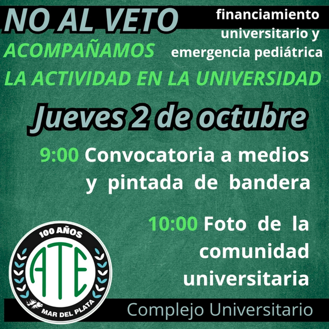 La Asociación de Trabajadores del Estado (ATE) Mar del Plata confirmó su acompañamiento y apoyo a la convocatoria de la comunidad universitaria contra el veto de Mieli.
