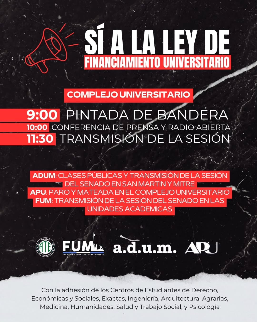 En el marco de las acciones colectivas que organizan los gremios de ADUM (Agremiación Docente Universitaria Marplatense), APU (Asociación del Personal de la Universidad) y ATE (Asociación de Trabajadores del Estado) junto a la Federación Universitaria Marplatense, este Jueves iniciará una nueva serie de acciones de visibilización de la comunidad universitaria.