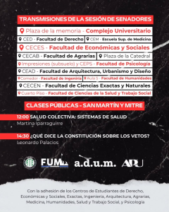 Asimismo, las organizaciones a cargo, indicaron que el cronograma incluirá «a las 9 una Pintada de bandera, seguido a las 10 por una conferencia de prensa y Radio Abierta», y agregaron: «A las 11:30 se transmitirá la sesión en todas las Unidades Académicas, y a las 12 y 14:30 se realizarán Clases públicas en San Martín y Mitre».