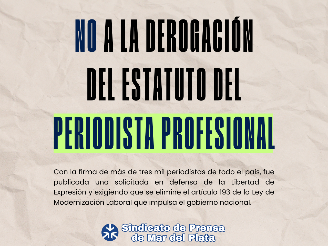 A través de sus redes sociales, el Sindicato de Prensa de Mar del Plata anunció la publicación de una solicitada que contó «con la firma de más de tres mil periodistas de todo el país» y «en defensa de la Libertad de Expresión y exigiendo que se elimine el artículo 193 de la Ley de Modernización Laboral que impulsa el gobierno nacional».