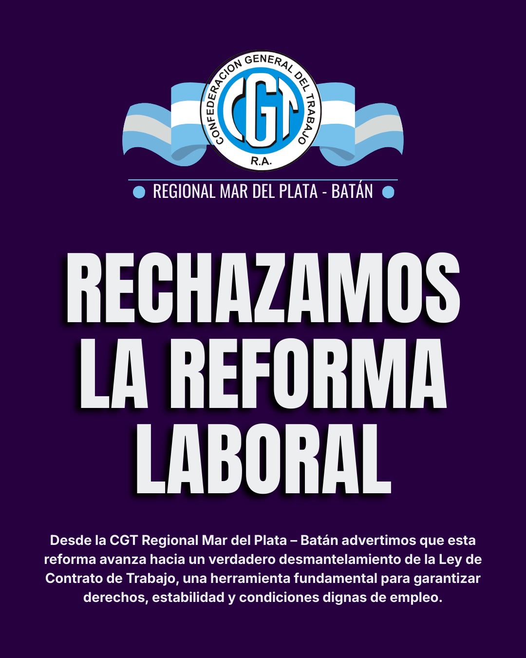 Finalmente, desde la CGT denunciaron que con este proyecto «no se trata de generar empleo genuino, sino de abaratar el costo de despedir, debilitando uno de los pilares centrales de la protección social en nuestro país», y aseguraron: «Desde la CGT Regional Mar del Plata – Batán advertimos que esta reforma avanza hacia un verdadero desmantelamiento de la Ley de Contrato de Trabajo, una herramienta fundamental para garantizar derechos, estabilidad y condiciones dignas de empleo». Por último, sentenciaron: «Frente a este intento de retroceso histórico, el movimiento obrero organizado reafirma su compromiso con la defensa del trabajo, la producción y la justicia social».