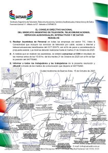 El Sindicato Argentino de Televisión, Telecomunicaciones, Servicios Audiovisuales, Interactivos y de Datos (SATSAID) anunció un «principio de entendimiento con ATVC (Asociación TIC, Video y Conectividad)» que «será puesto a consideración de las y los trabajadores en asambleas que se realizarán en todo el país hasta el próximo Martes 21 de Octubre a las 15».