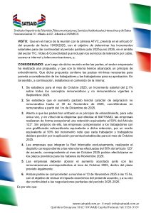 El Sindicato Argentino de Televisión, Telecomunicaciones, Servicios Audiovisuales, Interactivos y de Datos (SATSAID) anunció un «principio de entendimiento con ATVC (Asociación TIC, Video y Conectividad)» que «será puesto a consideración de las y los trabajadores en asambleas que se realizarán en todo el país hasta el próximo Martes 21 de Octubre a las 15».