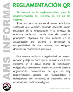 A través de un comunicado firmado por su Comisión Directiva, la Asociación Gremial de Empleados de Administración, Maestranza y Servicios de Casinos (AMS) celebró el avance «en la reglamentación para la implementación del sistema de QR en los Casinos».